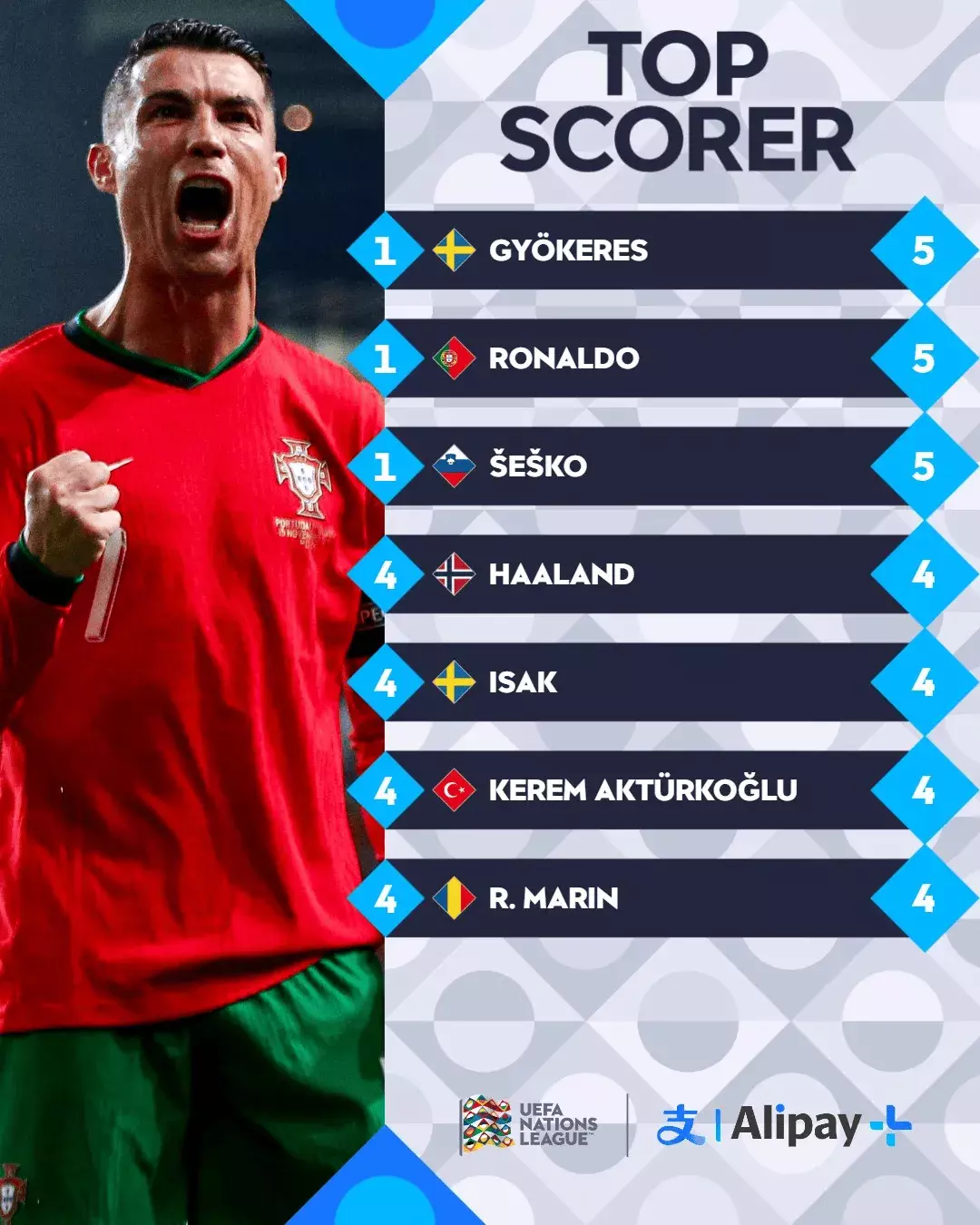 1 C罗 葡萄牙 5球